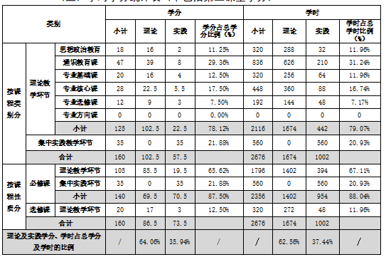 2.实验(实训)实践教学包括课内的实验(实训)实践以及集中实践实验教学环节:其中课内实验(实训)实践16学时记1学分;集中性实践实验环节1周计1学分,1学分按16 学时计;毕业实习(专业实习)、毕业论文(设计)等原则上每周计0.5学分;