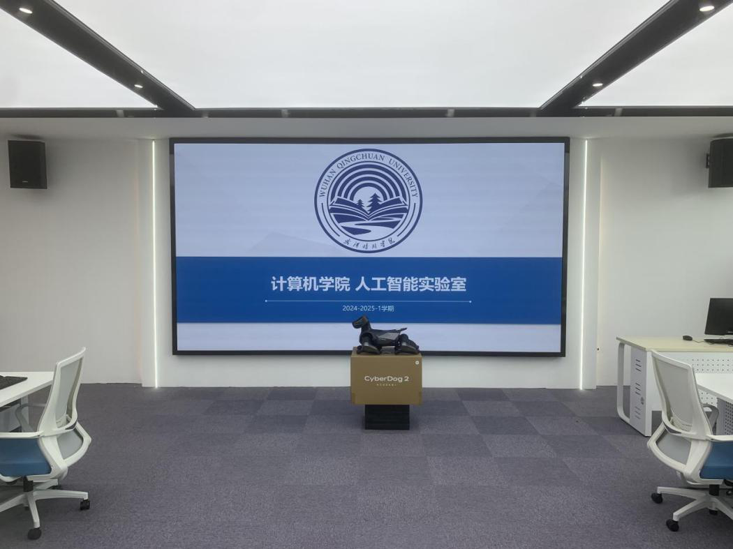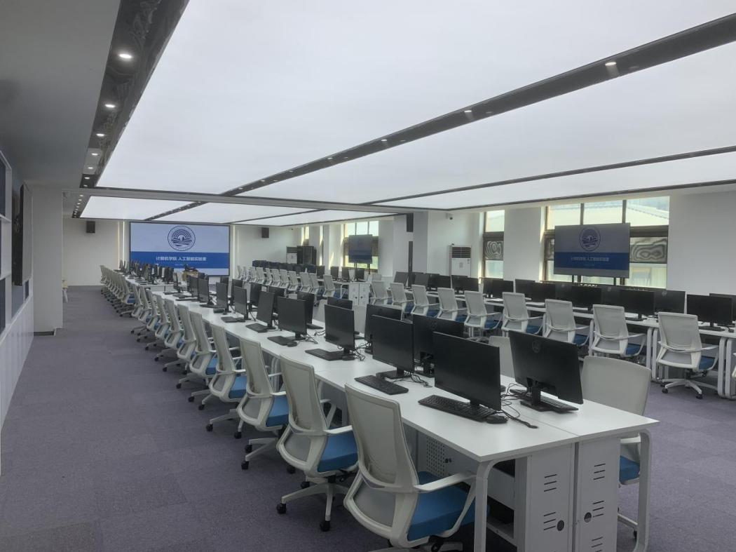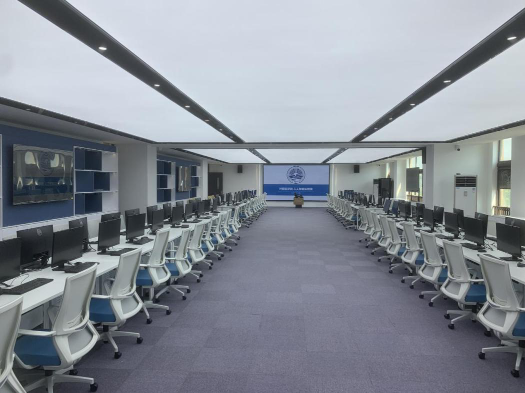 人工智能实验室于2024年暑期建成,占地面积达到290平方米,内部设计了两间独立的分实验室,通过灵活的隔断进行分隔。这种设计不仅允许将两个实验室合并为一个整体使用,以适应大型教学或研究活动的需求,也可以分别独立运作,满足不同课程或项目的教学需要。