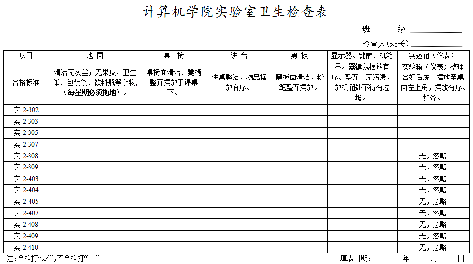 四、实验室工作人员应定期对实验室安全卫生进行检查,保持良好的实验环境(实验室内干净整洁,墙面、地面、门窗和设备无积灰、蛛网及杂物,实验仪器及相关设备布局合理、摆放整齐,消防通道畅通)。