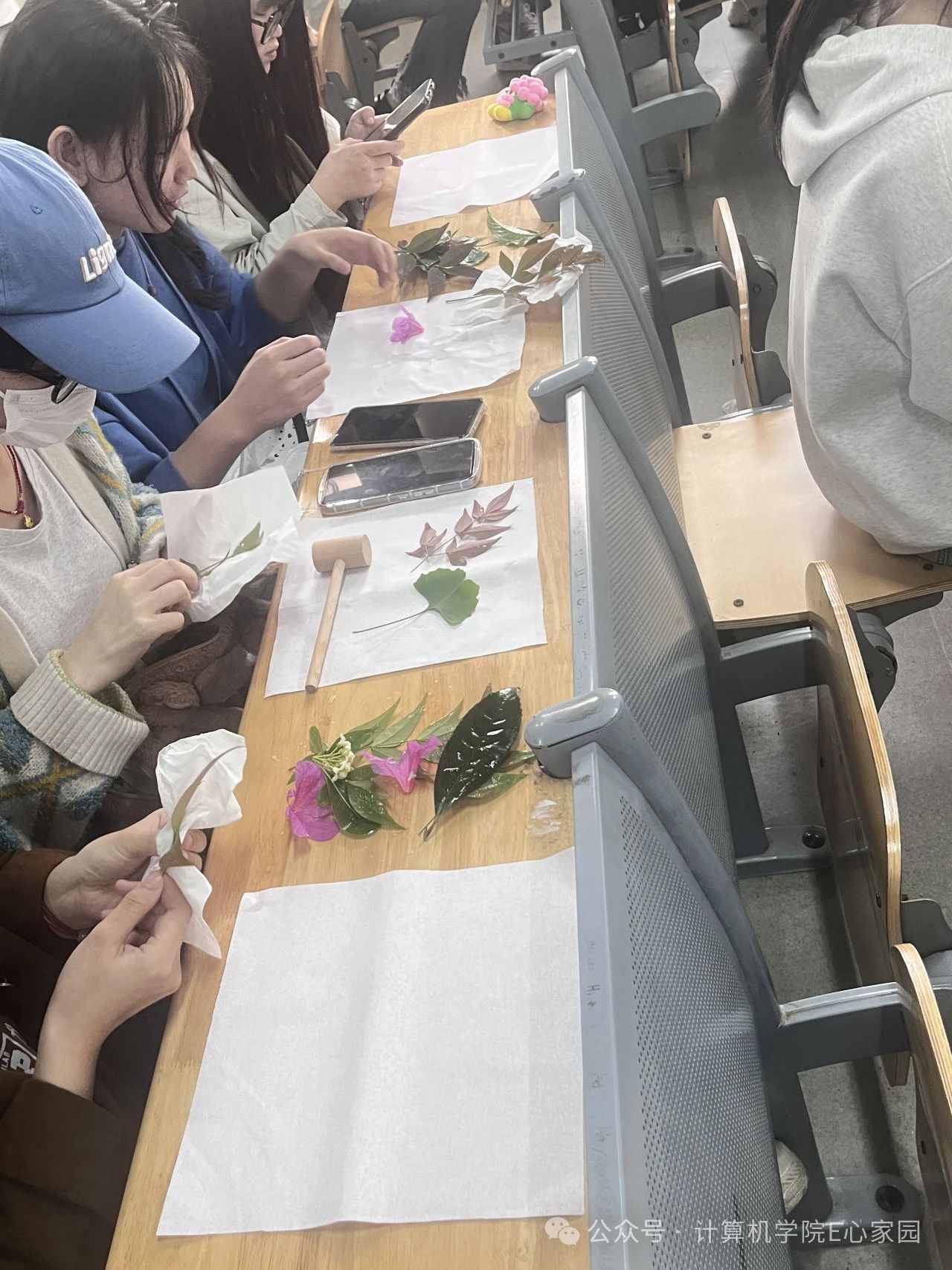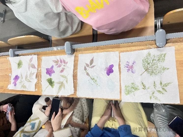之后,迎来了活动的重头戏——植物拓染环节。首先由手工艺协会成员介绍拓染环节和制作过程,介绍完如何拓染后,同学们齐心协力,从周围收集各种形态和颜色的树叶和花朵,用心将它们拓印在白色绵纸上。通过这个过程,同学们不仅感受到了自然的美丽和多样性,更深刻地体会到了创造的乐趣和艺术的魅力。每一片叶子和每一朵花都是独一无二的,饱含着大自然的神奇和诗意。