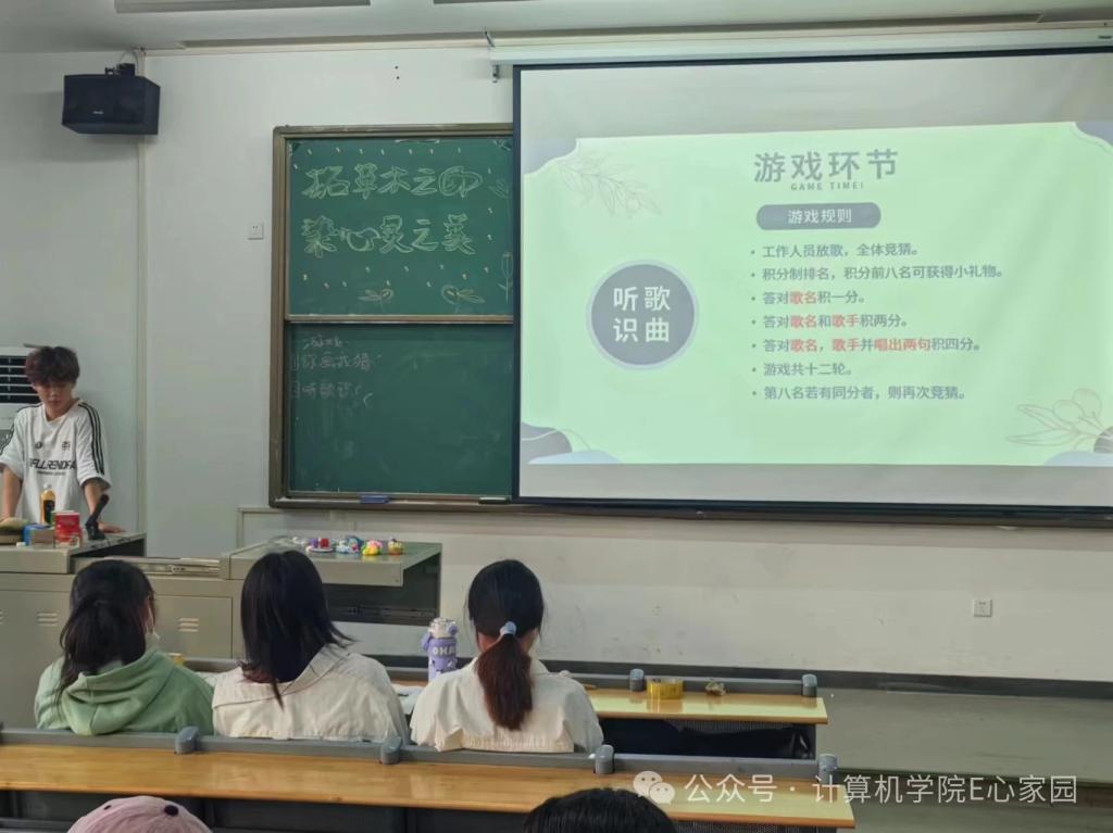 接着,进行了“听歌识曲”游戏。这个游戏考验了同学们对音乐的熟悉程度和记忆力,也增强了同学们的交流和互动。大家在猜中歌名的同时,不仅感受到了音乐的力量,更加拉近了彼此之间的距离,同时也会给予奖励,让活动更加有趣和丰富。