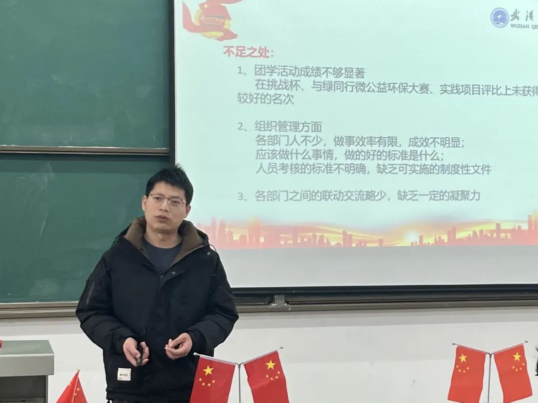 学生工作汇报与新学期工作部署。余延旺老师对2023年团总支以及学生会进行了总结发言。余老师阐述了团总支与学生会的定位,指出了去年团总支与学生会在工作上的不足。他表示,新学期的学生会,不同部门的部员之间要坚持紧密配合协作,不断磨合,各部员要严格要求自己,在工作上大胆创新。除此之外,余延旺老师也为大家回顾了2023年学院举行的各种活动比赛,并展示了新学期的各种活动比赛。