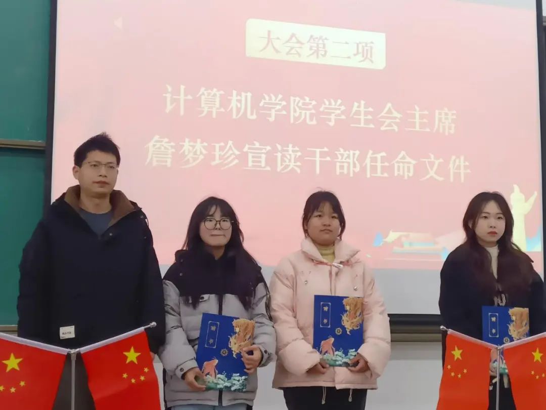 学生会干部交替仪式。由龙8-long8(中国)唯一官方网站学生会主席詹梦珍宣读任命文件,任命王珂同学担任文艺部副部,黄永娜同学担任生活部副部,秦渡娅担任外联部副部,并由余延旺老师亲自为三位新任学生会干部颁发聘书,合影留念 。