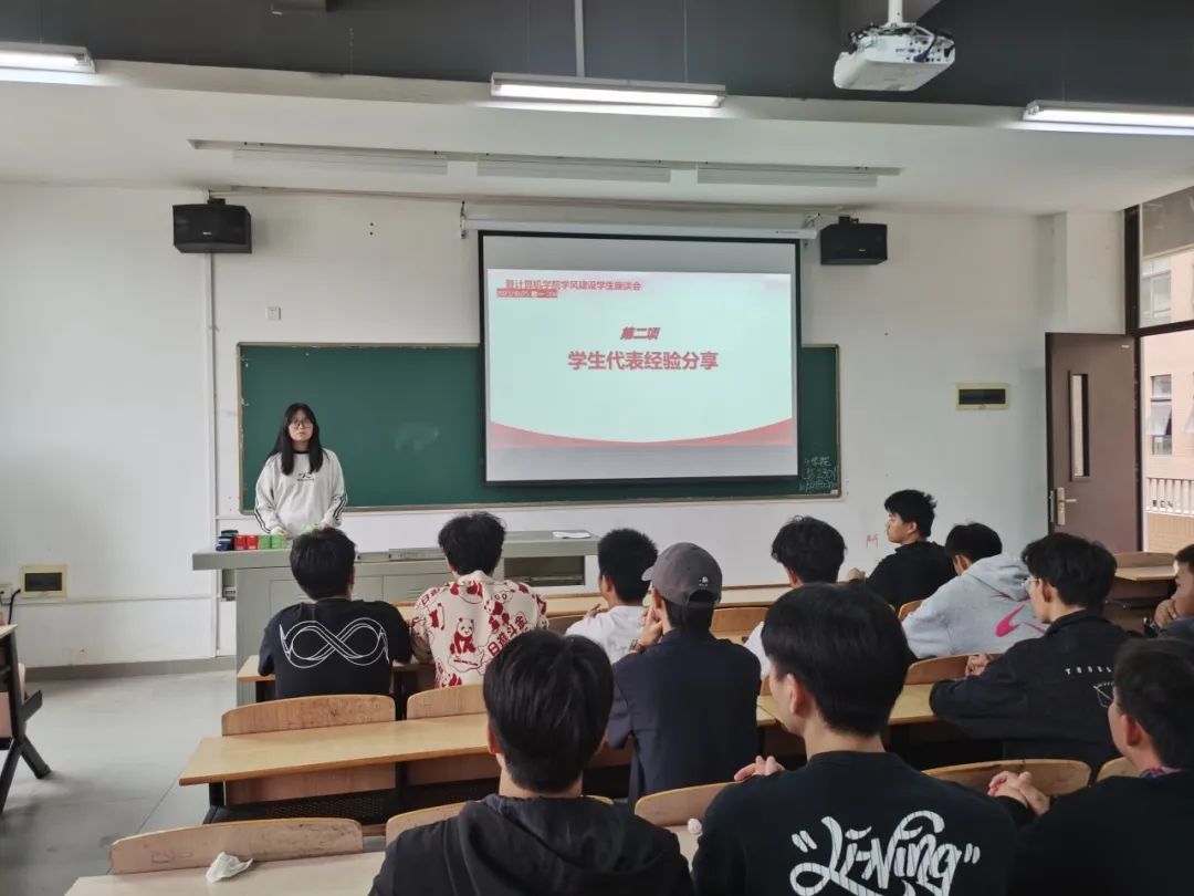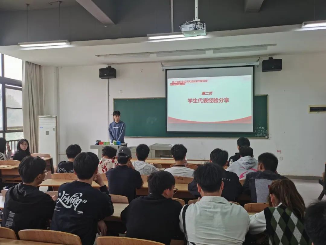 会议第二项由学生代表杨晨同学和丁凯同学作经验分享,杨晨同学提到班级管理就好像学习知识一样需要进行回溯,找到班级发生的问题、找出问题的本质,从而才能更好地去解决问题。丁凯同学强调我们作为班上的主干力量和班级的引导者,应当发挥自己的表率作用。引领班级同学树立正确的学习态度,营造一个良好的学习氛围。他认为班干需要发挥自己的优势与职权主动履行职责,更要注重团队合作。学风建设需要全体师生的齐心协力,我们作为学生代表也更应该发挥团队精神,可以积极参与各类学科竞赛和文艺活动来带动同学,多与同学们互相交流、并共同进步。
