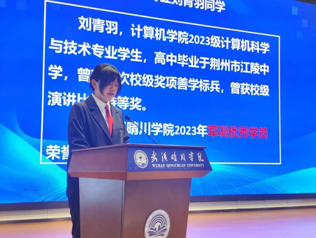 活动第三项,由2023级的新生代表刘青羽同学发言。他提到要以优秀学姐学长为榜样,在以后的生活中锻炼自己的能力,勇于拼搏,敢于吃苦,也表达了自己对未来充满了美好的憧憬和向往。