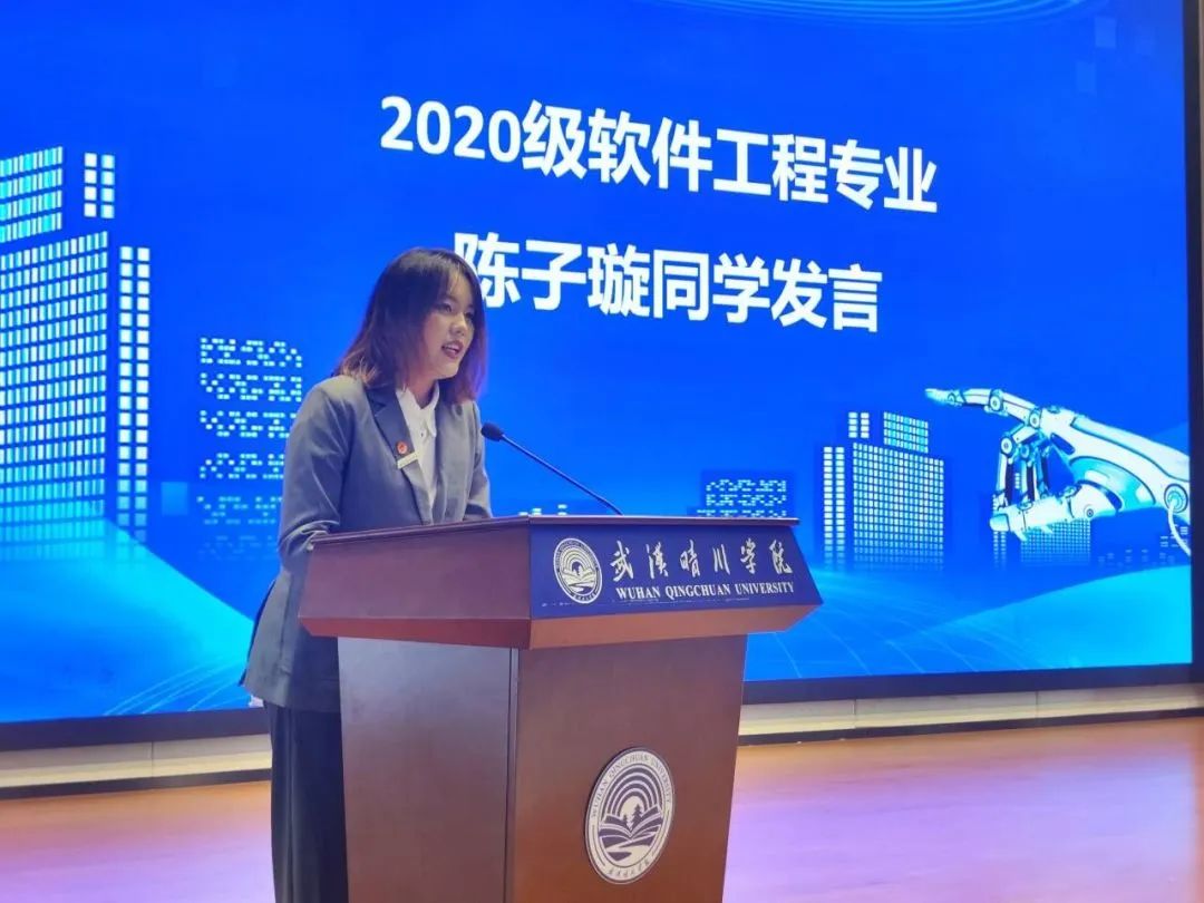 活动第二项,老生代表2020级陈子璇同学发言。在校期间,陈子璇同学一直努力学习积极进步,专业成绩连续三年位列第一,曾任学生会副主席,并且积极参加各类竞赛,并获得了优异的成绩,她表示,作为学生,要在学习自身专业知识的同时培养自身兴趣,同时也要积极向党组织靠拢,不畏艰险,永攀高峰。
