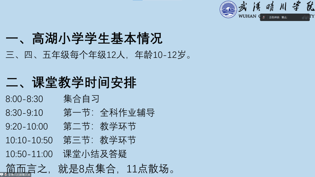 会议伊始,黄雪老师对高湖小学的基本情况进行了一个简单的介绍,在教学时间上做了一个大致的安排,关于教学方面也提出了要求,同时对于本次的教学内容作出了细致的规划。
