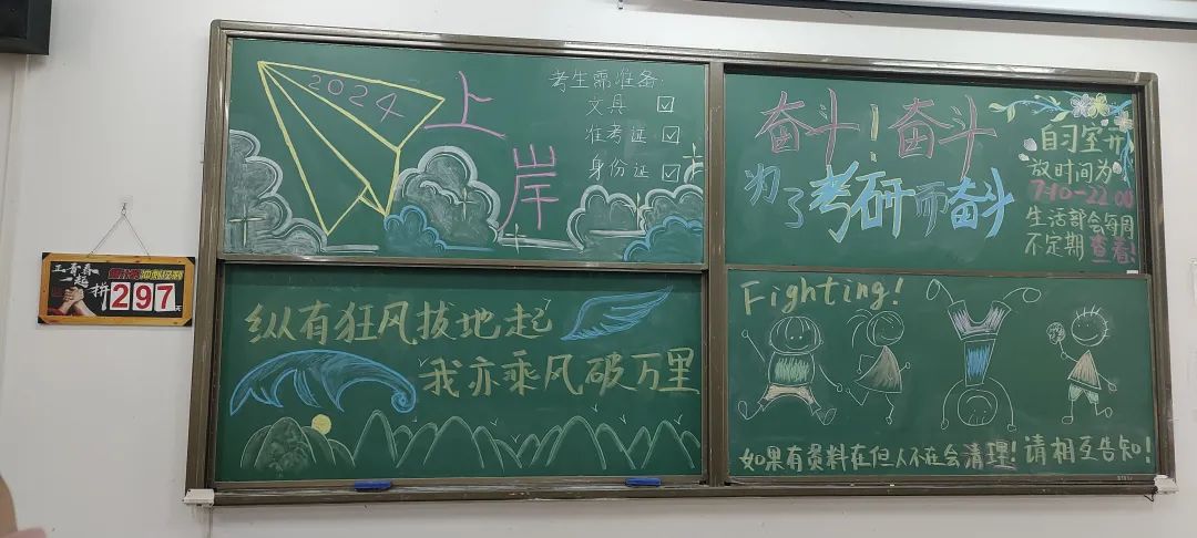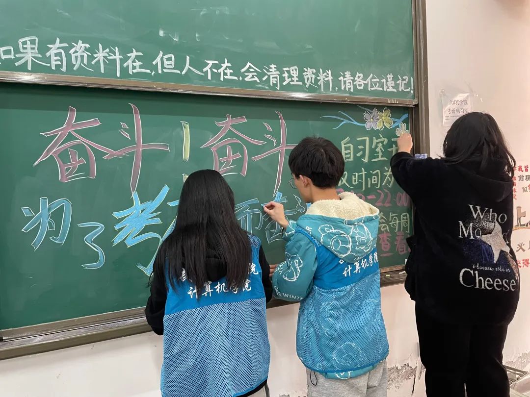 板报在自习室里是不可或缺的,它不仅是同学们学累了抬头时的慰藉,也是自习室内的纪律与规则。大家前一天便展开了关于板报设计的讨论与交流,在充足的准备下,精美的画报很快就出现在黑板上。希望学长学姐们在这条荆棘遍布的路上,步步生花。