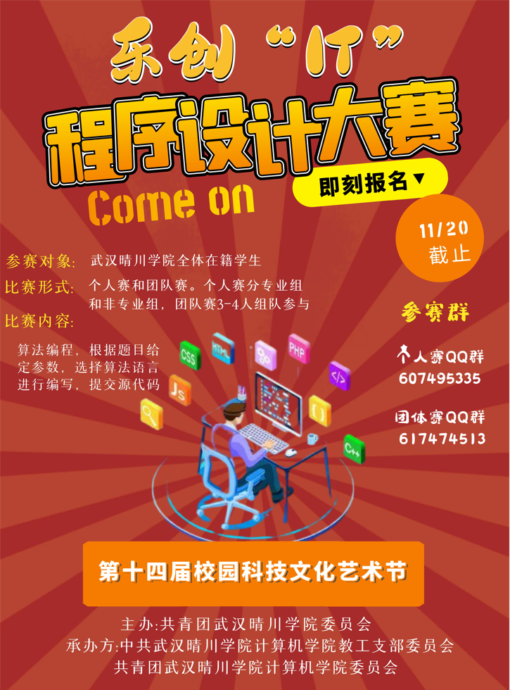 编程没有模板,只需心灯一盏。本次推迟的“乐创IT”程序设计大赛圆满结束,非常感谢参与本次比赛的晴川学子们,明年我们将以更好的姿态,更优质的题目面向大家,让我们一起进步,同攀高峰。