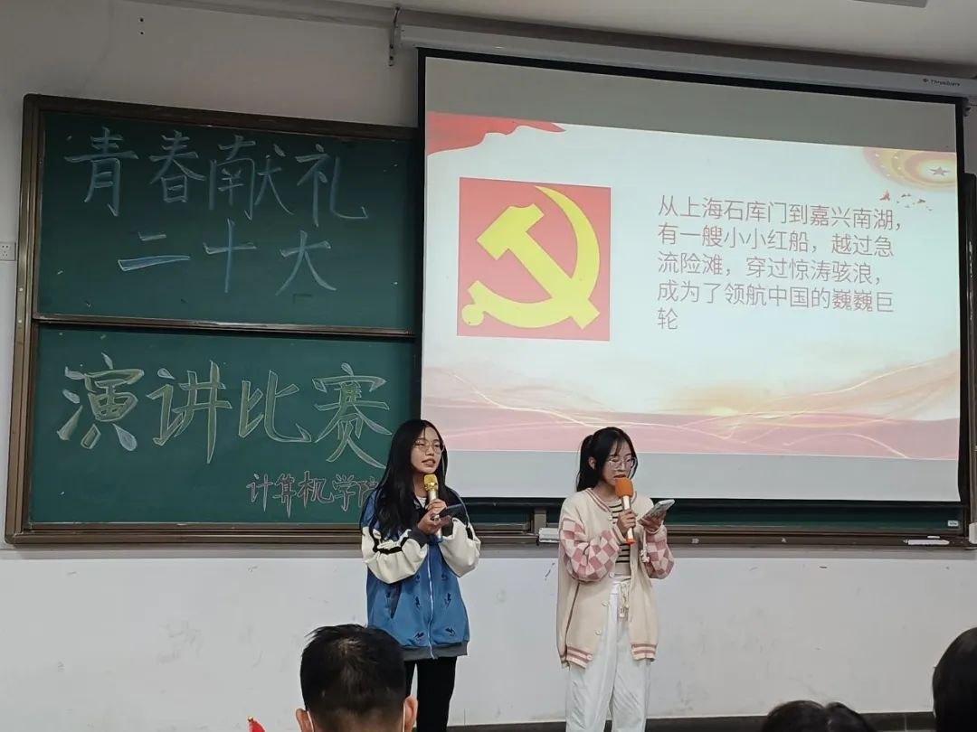首先上场的是来自计科2201的陈运琦,她回顾党的艰辛历程,用悠扬婉转的音调,温柔的阐释她对党、对中国的热爱,歌颂中国共产党的丰功伟绩,歌颂中国共产党人的拼命与无私。20世纪对中国来说是充满苦难的世纪,是拼搏战斗的世纪,也是扭转命运,走向辉煌的世纪。陈运琦同学用她的真切情感打动了在场的观众,让我们更明白了中国当代青年的使命。