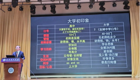 随后,院长黄传河开启和新生长达一个半小时的“对话”。他开篇提到四个字“追求卓越”,追求卓越不是一定要做到第一,而是要勇于探索新的领域,立足专业,突破自我,实现自身的价值。并对高中与大学的区别做了精辟的总结,提到“到了大学就解放了”等标语是对学生的误导;高中时老师是保姆,大学老师则经常见不到;高中讲的慢,讲的细,大学则是快节奏;高中刷题考高分,大学要学会思考和创新。