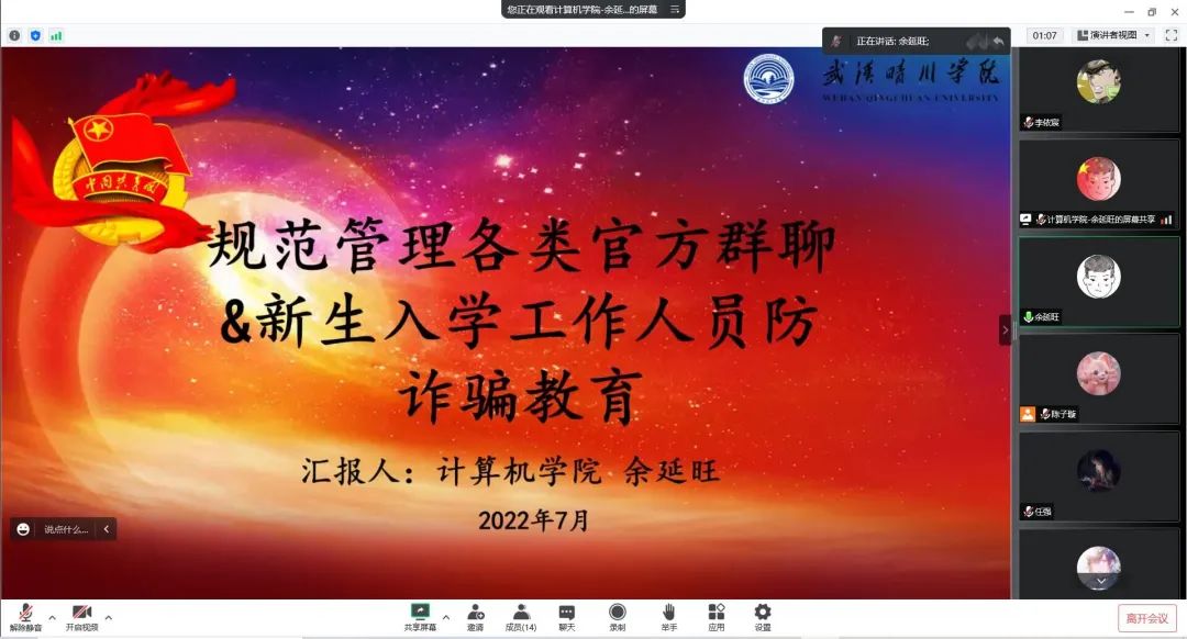 龙8-long8(中国)唯一官方网站团总支、学生会7月29日于腾讯会议举行“规范管理各类官方群聊&新生入学工作人员防诈骗教育”为主题的线上会议,为保障新生入学工作的开展,各部门部长、副部长准时参加本次线上会议。