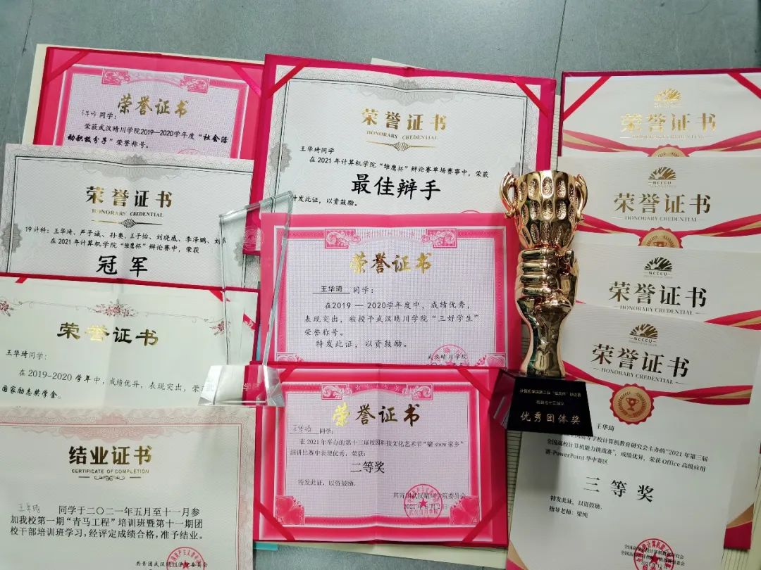 2021年获人福奖学金、三好学生、雏鹰杯冠军、两次雏鹰杯最佳辩手、锦绣家乡校级二等奖、计算机挑战杯科学作品竞赛优秀奖、普通话二甲、参加青马工程干部培训班。