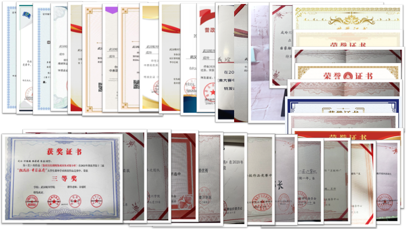 获得晴川talk秀一等奖,第十三届“挑战杯”大学生课外学术科技作品《篡改历史现象成因及对策分析》湖北省赛三等奖,第三届传智杯全国大学生IT技能大赛程序设计赛道(B组)全国三等奖,中国大学生计算机设计大赛(微课与教学辅助组)中南地区三等奖,中国大学生计算机设计大赛(数媒动漫与微电影组)中南地区二等奖,中国大学生计算机设计大赛(数媒动漫与微电影组)《黄桥——乡韵古镇》全国优胜奖,此外,在其他项目中还获得全国优秀奖,全国一等奖,全国二等奖,全国三等奖等奖项
