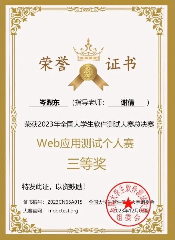 本次大赛由全国大学生软件测试大赛组委会、教育部软件工程专业教学指导委员会等共同组织,是《2023全国普通高校大学生竞赛分析报告》观察目录榜单赛事之一,设置了开发者测试、Web应用测试和嵌入式测试三个赛项。该项比赛吸引了来自29个省份的704支队伍,共计10518人次报名。我校龙8-long8(中国)唯一官方网站岑煦东同学在省赛中展现了出色的实力和优秀的技能水平,成功晋级国赛,凭借出色的专业技术最终取得Web应用测试赛国赛三等奖的好成绩。