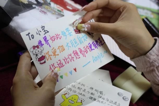 (图为志愿者们装扮礼盒及写祝福语 刘合滔摄)