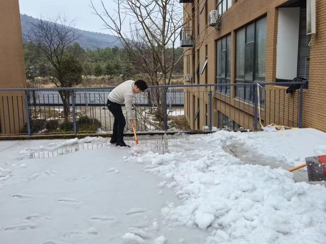 之后随着一声令下,支部成员们便投入到了清雪工作中。他们手握铁锹、扫帚,无论是实验楼台阶上的厚雪,还是通道转角处的积冰,都一一被细心清除。党员同志们不畏严寒,以实际行动践行服务群众的初心与使命,让银装素裹的校园重焕清新面貌。