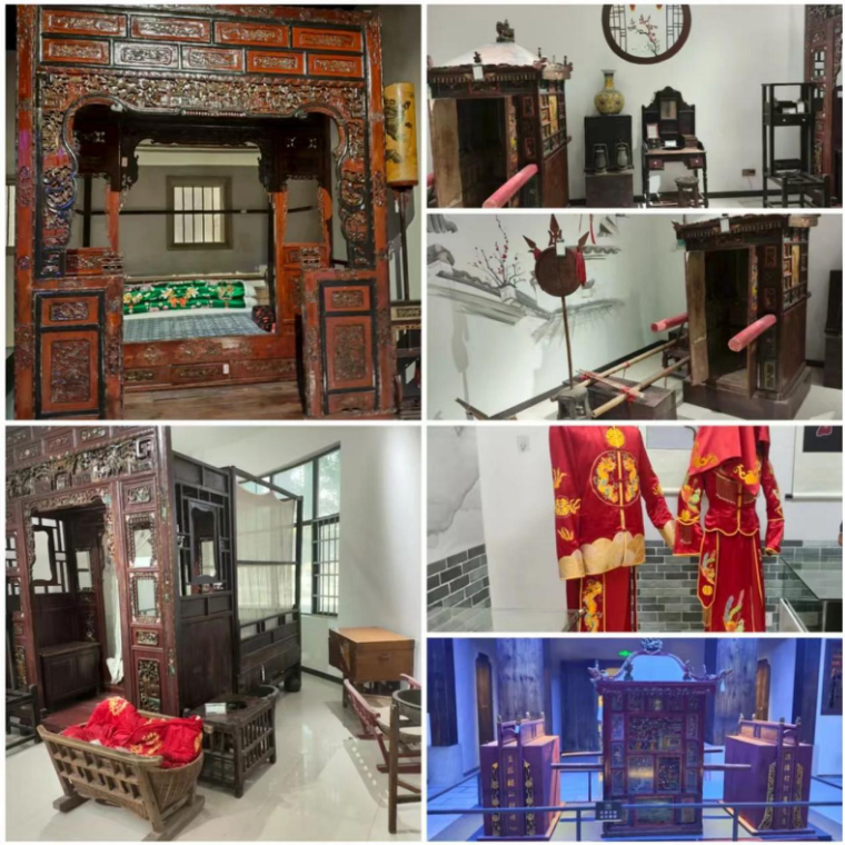 婚姻是人生的重要里程碑,阳新地区的婚俗文化承载着对幸福生活的美好期许。在民俗馆的婚俗展区,通过实物、场景复原与图文展示,我们得以聚焦传统婚俗中最具象征意义的“花轿”与“床具”,感受其中蕴含的匠心与祝福。