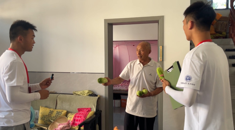 “刘昌毅将军故里 七里坪镇马鞍石湾欢迎您”,红字白墙的标语,是故里给我们的第一张“名片”。在走访数户人家后,我们终于寻得刘昌毅将军的亲侄子刘爷爷。老人的热忱如盛夏骄阳般灼人,几番盛情相赠之下,实践队队员们各自收获了他亲手栽种的黄瓜。那是带着泥土气息的质朴馈赠,更似将军家风里“清正纯粹”的滋味在舌尖流转。