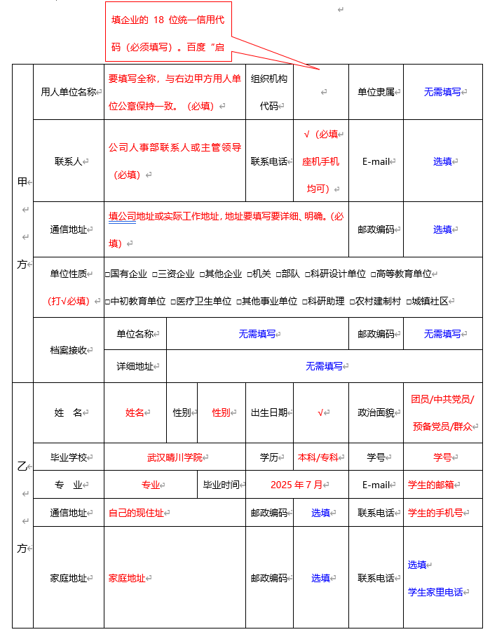 甲方(用人单位公章):盖公司公章或人事部的章(印章必须清晰) 乙方(毕业生):
