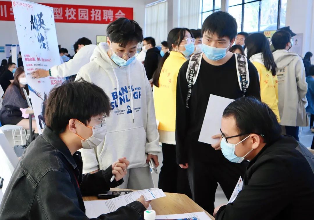 招聘会场严格按照防疫要求布置,秩序井然。招聘单位热情向同学们介绍公司的发展概况、发展方向、人才需求等。毕业生们有序排队,根据所学专业、自身能力、兴趣爱好、公司薪资待遇等综合考量,向心仪企业投出精心准备的简历,积极与招聘单位进行沟通交流。现场的热烈气氛还吸引了许多非毕业班的同学前来,提前了解就业前景。现场氛围十分“火爆”,每位应聘者都自信满满。