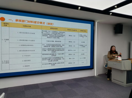 教学副院长裴浪将本次专业评估大会内容分为四大要点:第一点是审核部门材料提交情况;第二点是材料组织、撰写存在的问题;第三点是材料上传存在的问题;第四点是材料审核存在的问题。本次会议指出专业负责人调整、实验室开放情况,并重点指出材料组织、撰写存在的问题,教学副院长裴浪向我们展示合格以及创优板块的提交材料的正确格式内容、材料组织说明、审核部门以及完成时间以及材料提交情况。对于专业评估合格板块来说,主要强调了人才培养方案、教学条件与利用以及培养过程这3个观测点的重要性;对于专业评估创优板块来说,主要强调了立德树人以及专业定位与规划这2个观测点的重要性。