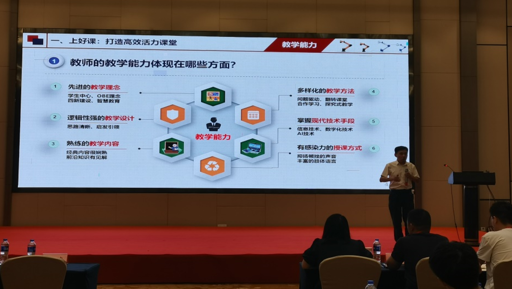 会议伊始,武汉科技大学侯宇教授以“提升教学能力,创新教学方法,突破教学竞赛”为题,为与会教师带来了一场深入浅出的讲座。侯教授结合自身丰富的教学经验,详细阐述了如何通过创新教学手段打造高效活力课堂,首先要有以学生为中心的OBE教学理念,同时具备逻辑性强的教学设计能力,掌握多样化的教学方法和现代技术手段,用极富感染力的授课方式来激发学生的学习兴趣。他强调,在当今教育快速发展的背景下,提升教学能力不仅意味着掌握扎实的专业知识,更要求教师们能够紧跟时代步伐,不断创新教学方法,以激发学生的学习兴趣和潜能。