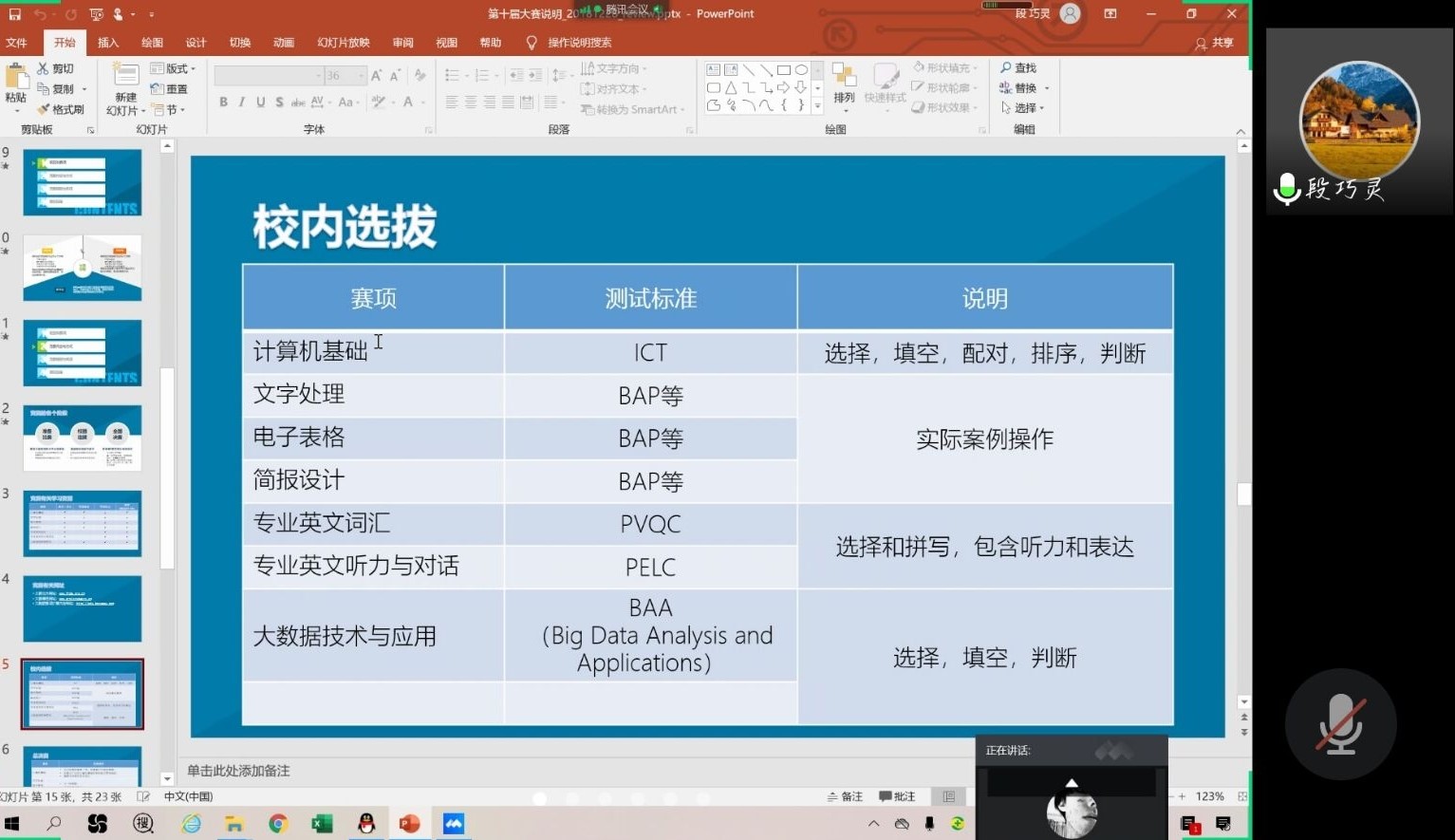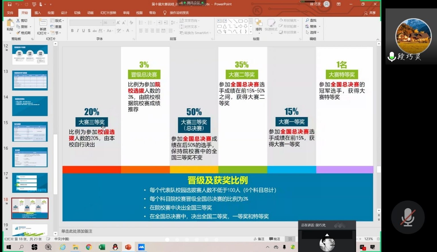 每个代表队校园选拔赛人数不低于100人,每个科目院校赛晋级全国总决赛的比例为3%,在院校赛中决出全国三等奖,在全国总决赛中决出全国二等奖,一等奖以及特等奖。段巧灵老师向同学们介绍了校内选拔赛和总决赛的赛项标准和说明。