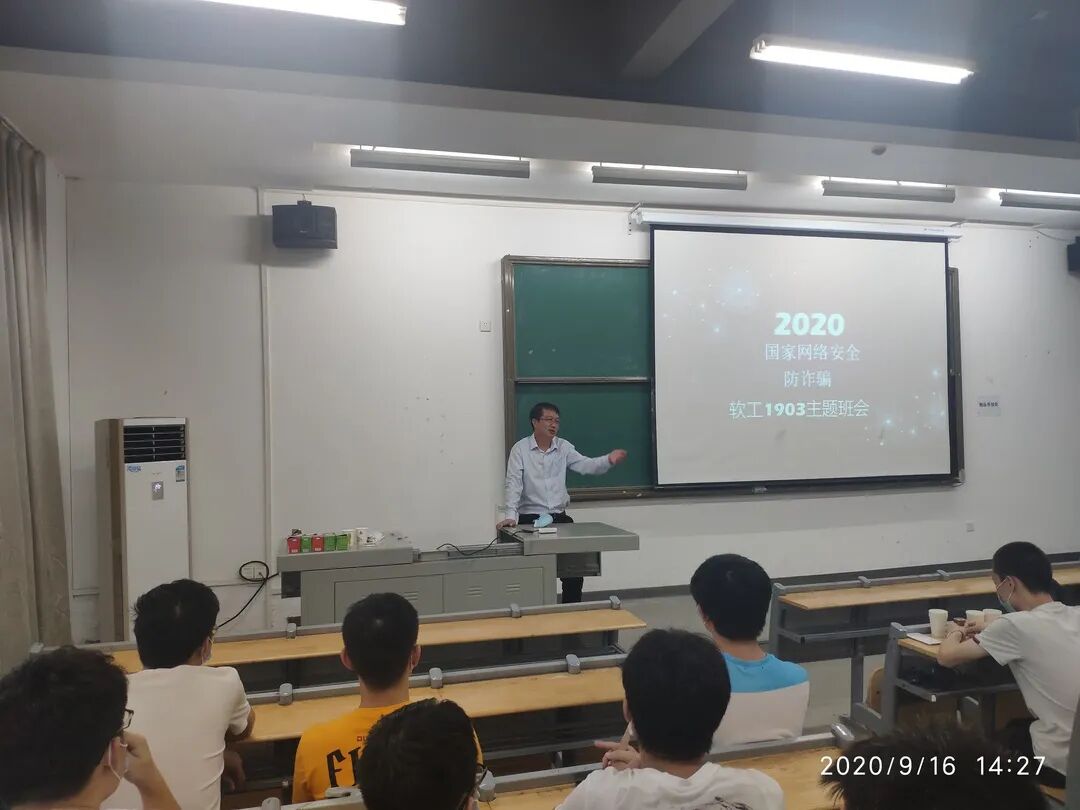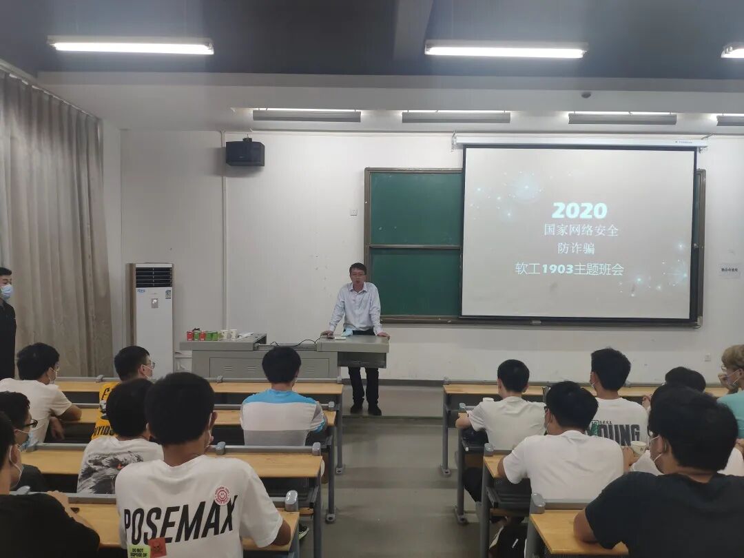 2020年9月16日,伴随着绵绵细雨,龙8-long8(中国)唯一官方网站校党委书记翟细春同志深入软工1903班召开了以“网络信息安全和防诈骗”为主题的班会,在班会开展过程中,翟书记热情地与学生互动交流。
