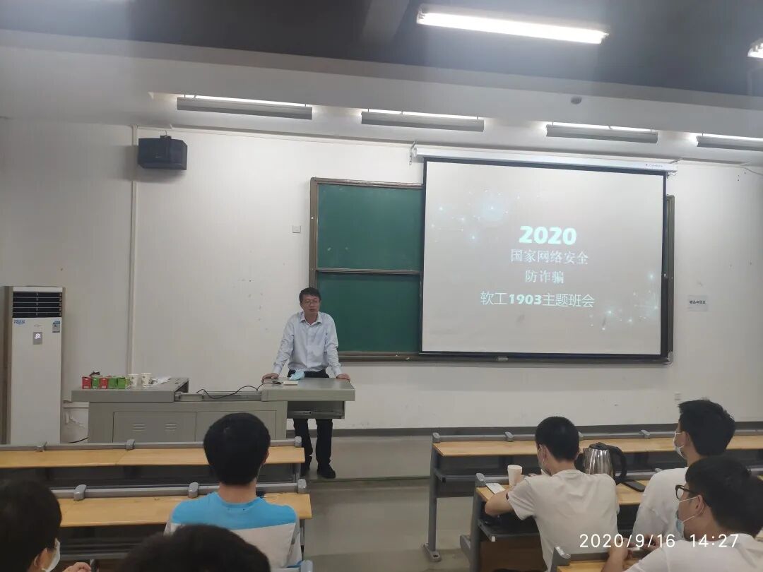 翟书记首先对同学们全部安全顺利返校,并全身心投入正常学习和生活的现状表示满意,强调返校后疫情防控仍将持续,以及需要各位同学、各个班团组织的强力配合。接着翟书记用自己处理过的被诈骗同学实例告诫各位同学在日常生活中,千万不要掉以轻心,要建立良好的防范意识,遇到诈骗等嫌疑事件要及时向学校报告,向当地地方公安机关举报!