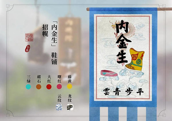此次比赛中,由朱琳老师、徐嘉老师指导,刘霆钧、刘锐、孙玲参与设计创作的《磨剪子戗菜刀》荣获二等奖并推选至国赛。该作品从文字招幌和图形招幌入手,选取了对于古代商业比较有代表性的鞋铺、当铺、首饰铺的招幌,进行绘制。此外,该组同学选取了历史上真实存在的「内金生」、「义和」、「裕源」三个字号为原型进行创作加工,并且尝试使用电脑绘画水墨画来还原「千里莺啼绿映红,水村山郭酒旗风」所描绘的景象。