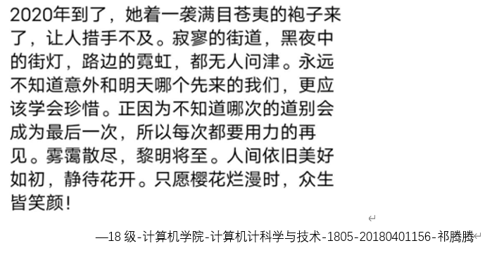 2020年的开端,没有人会想到是这样的开始,疫情在中国开始蔓延,截止到5月21号,全国共有8万4千余人被感染,4千6百余人死亡,一个个鲜红的数字代表了一个个消逝的生命。无数的医务工作者不顾个人的生命安危,化身白衣天使,他们的生命更是高尚的,值得我们尊敬的!我们也更加明白了生命的可贵。希望逝者安息,愿生者坚强奋发!愿祖国强大!