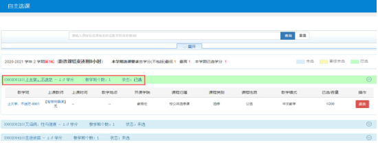 Step2:选择心仪的的课程,点击相应教学班后的“选课”按钮,选课状态变为“已选”即可,两轮选课所选课程门数之和不可超过4门,否则无法成功选课。选课成功时界面如下: