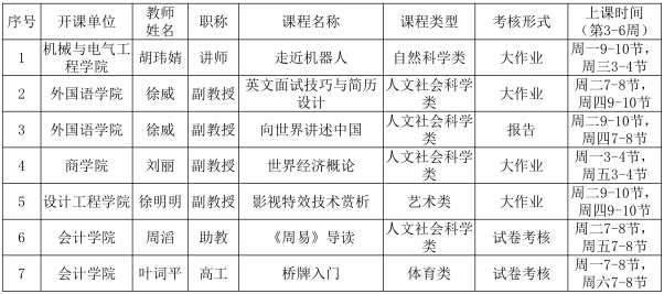 本次可选公选课课程均为校内专任教师主讲的线上课程(线上教学通道稍后公布),开课周次为第3-6周,每门课程均为1学分、16学时,具体课程安排见下表: