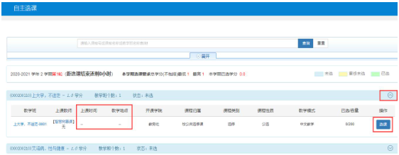 Step1:“选课”-“自主选课”,不设置任何查询条件,直接点击“查询”按钮出现可选课程,点击相应课程的展开按钮,出现课程教学班上课安排,界面如下: