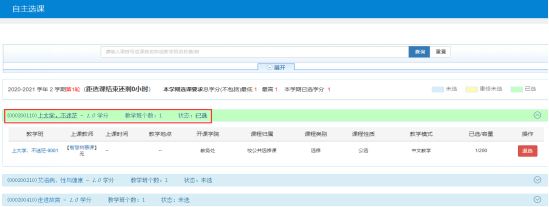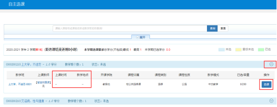 Step1:“选课”-“自主选课”,线下面授课程可设置“上课星期”和“上课节次”进行查询选课,“智慧树慕课”可设置“开课学院”为“教务处”进行查询选课;点击相应课程的展开按钮,出现课程教学班上课安排,界面如下: